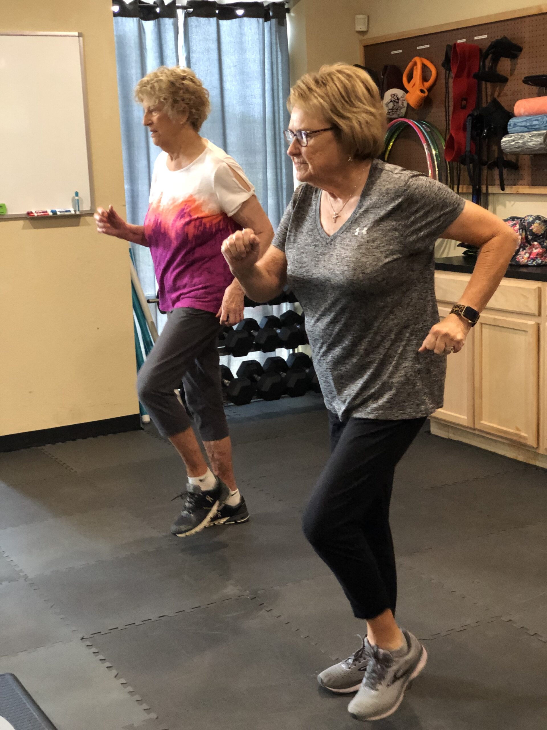 - Silver Sweaters – This 30-minute class is geared towards ‘senior fitness.’ A variety of equipment such as hand weights, resistance bands, stability balls, medicine balls, steps and chairs are utilized and can be adjusted to meet every client’s strength. The goal is to increase strength, flexibility, balance control and stamina.